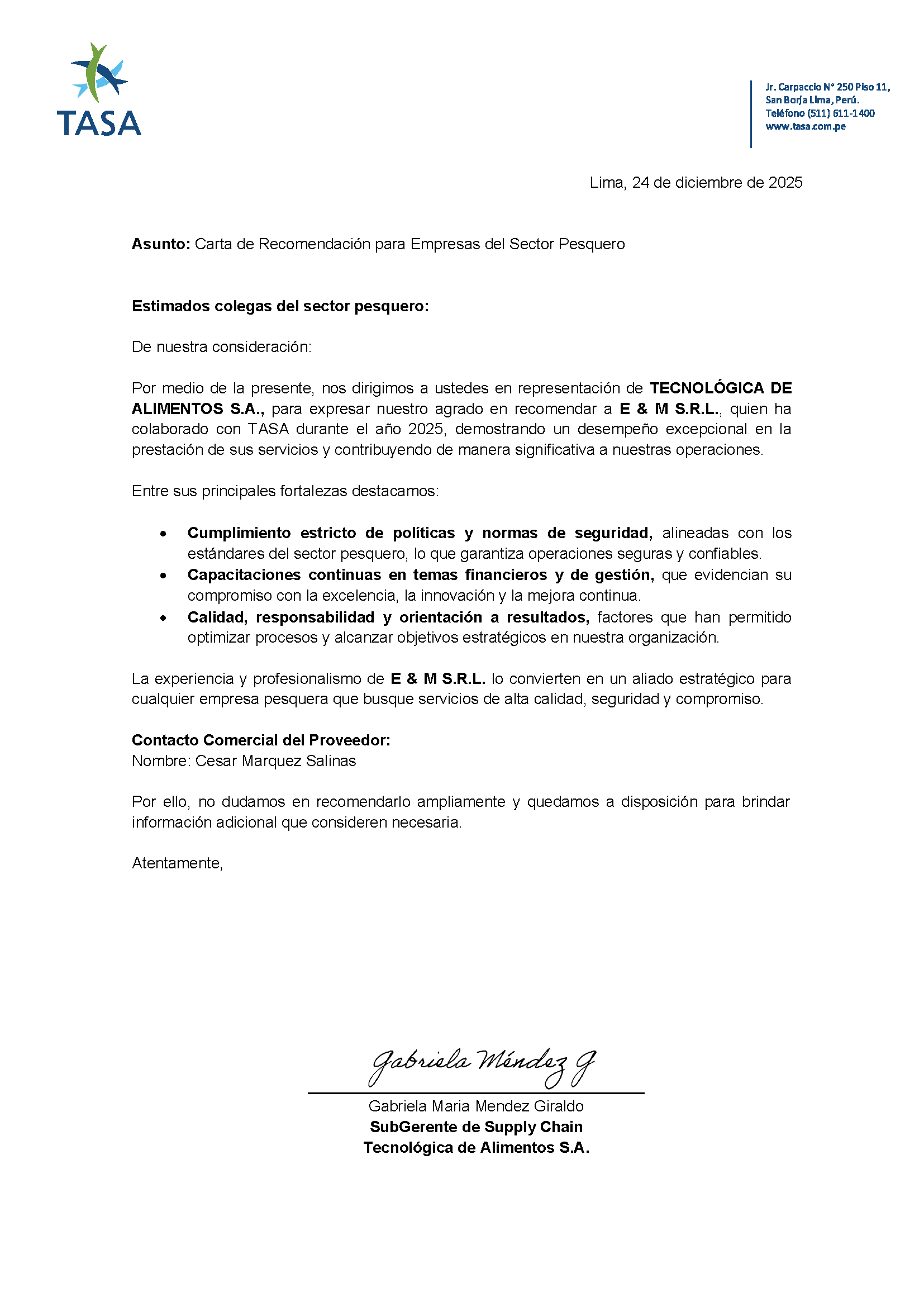 E&M S.R.L. ha sido reconocida por Tecnológica de Alimentos S.A. (TASA) mediante una carta de recomendación oficial, en la que se destaca su desempeño excepcional, profesionalismo y contribución significativa a las operaciones del sector pesquero durante el año 2025.